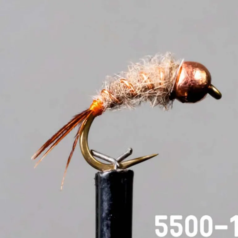 5500-1 : Nymphe courbée lourde et classée comme nymphe imitative. Montage en lièvre ébouriffé avec cerques pour proposer un aspect naturel. Bille et cerclage en cuivre pour garder un aspect neutre. Avec Tag orange à l’arrière pour apporter un léger signal incitatif à l’imitation.