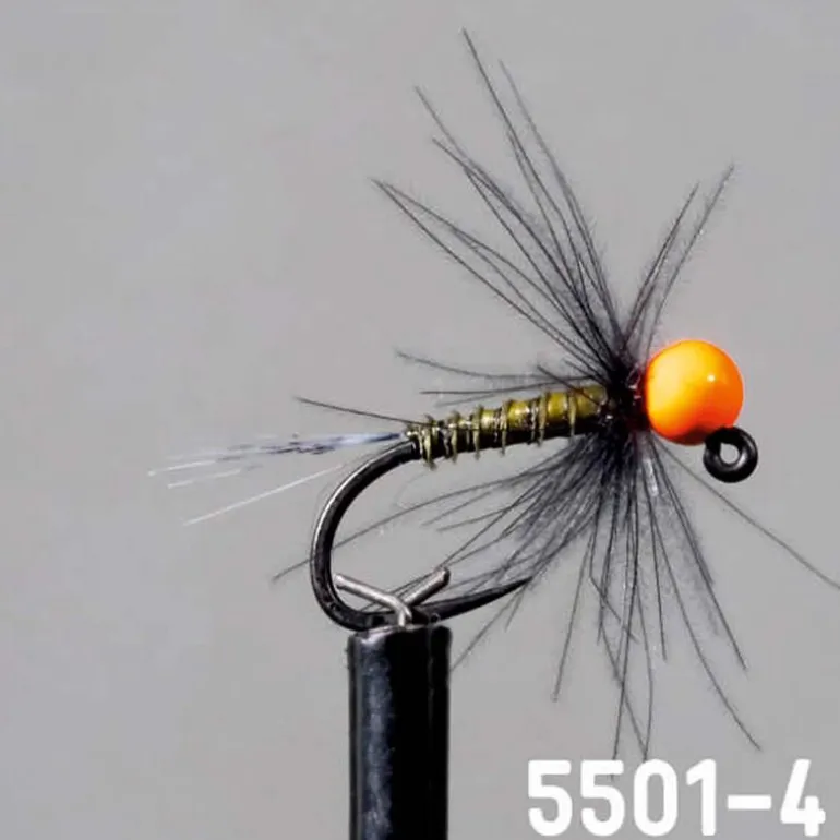 5501-4 : Nymphe droite lourde et classée comme nymphe incitative. Montage jig avec corps en quill segmenté olive noir, ajout de cerques et collerette noire pour donner plus de réalisme. Bille orange en tête pour mettre en évidence l’imitation.