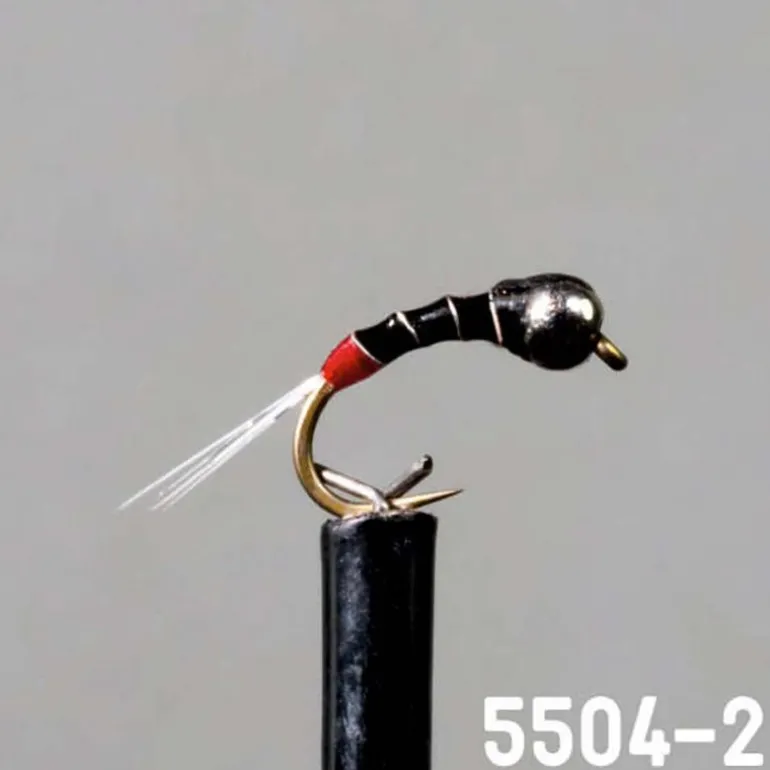 5505-2 : Nymphe courbée légère et classée comme nymphe imitative. Montage perdigone en corps lisse noir avec cerques qui facilite l’immersion. Complémenté d’un cerclage fin en argent et d’un tag couleur sang à l’arrière pour apporter de légers signaux incitatifs à l’imitation.