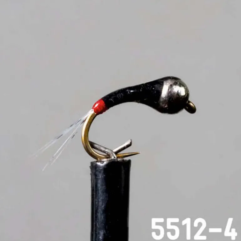 5512-4 : Nymphe moyenne courbée et classée comme nymphe imitative. Montage perdigone en corps lisse noir avec cerques qui facilite l’immersion. Complémenté d’un tag couleur sang à l’arrière pour apporter un léger signal incitatif à l’imitation.