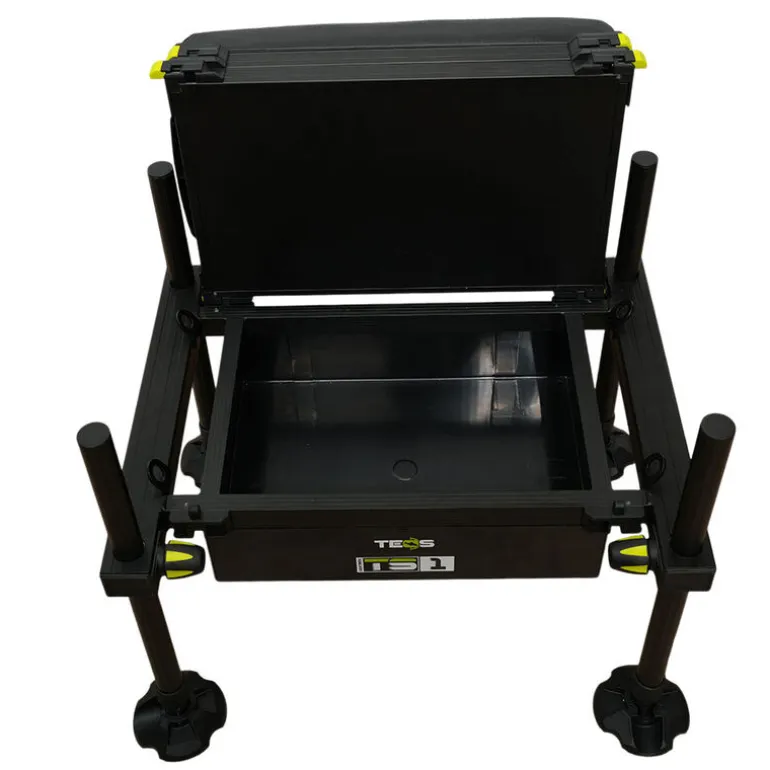 La station TS1 SEATBOX est le modèle le plus léger et le plus compact de la gamme. Son poids plume de 8.5 Kg la rend très facile à transporter. Elle dispose pour cela de 4 pieds fixes en D30 qui offrent un excellent compromis entre légèreté et stabilité. Son assise est dotée d’un dossier repliable qui assure un excellent maintien des lombaires pour un confort accru en action de pêche. Elle est équipée d’origine d’un bac profond sous l’assise qui permet de stocker facilement les accessoires plus volumineux tels que les coupelles, les frondes ou même les appâts/amorces. Son tiroir latéral de 30mm de profondeur permet quant à lui d’avoir un accès facile à vos petits accessoires en cours de pêche : il est parfait pour accueillir vos plombs, hameçons, sondes ou encore vos outillages tels que des ciseaux ou votre pince à plombs.