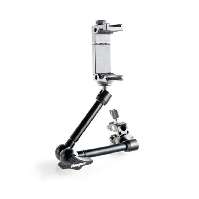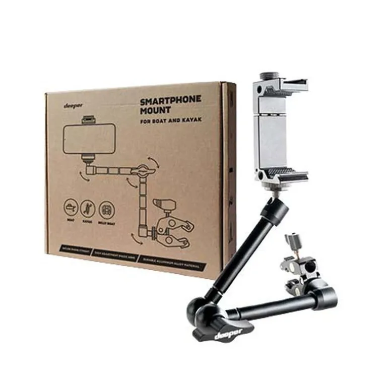 Il suffit simplement de fixer le support à votre embarcation grâce à la pince C-Clamp, de placer votre smartphone dans le support et de régler le bras du support. Installez vous vous, démarrer votre appli Deeper !