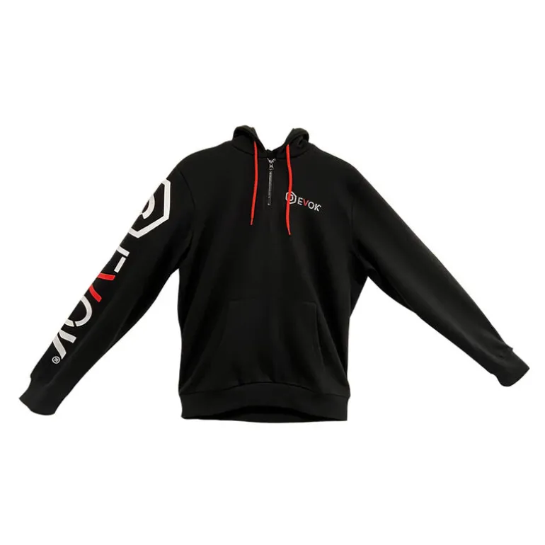Il y a un zip au niveau du col. Un logo au niveau de la poitrine et unlogoEvok sur tout le long de la manche. Un logo dans le dos en bas à gauche du sweat.