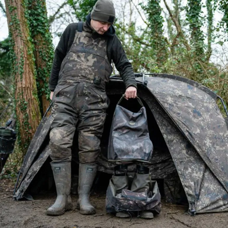 Le Subterfuge Waterproof Wader & Boot Bag propose une solution 2 en 1, permettant de transporter vos cuissardes et bottes mouillées ou boueuses dans un véhicule sans en mettre partout. Il inclut également une couverture ingénieuse pour protéger vos équipements de la pluie lorsque laissés à l’extérieur d’un bivvy. Il suffit de soulever la poignée supérieure pour enfiler vos cuissardes ou bottes.